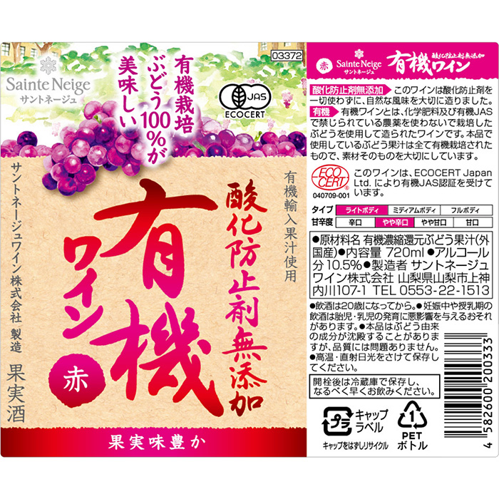 酸化防止剤無添加且つ有機認証団体 エコサート・ジャパン㈱ 認証の有機JAS酒類です。