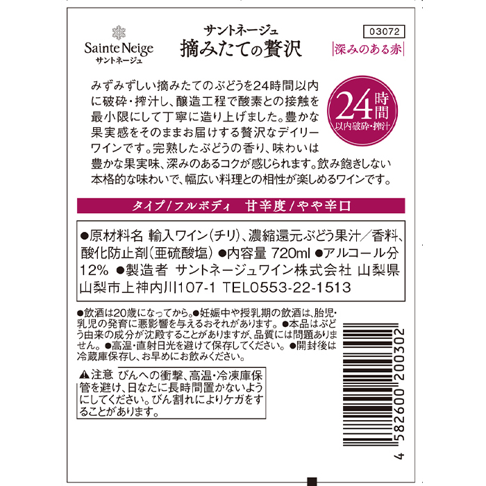 完熟したぶどうの香り、味わいは豊かな果実味、深みのあるコクが感じられます。飲み飽きしない本格的な味わいで、幅広い料理との相性が楽しめるワインです。